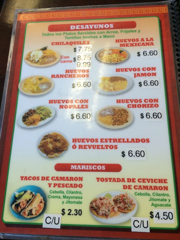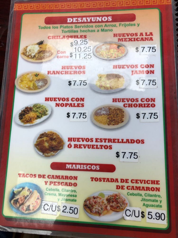 Your choice of red(spicy), green(mild) or both sauces. Two eggs, your choice of protein, onion, queso fresco, sour cream and bread.